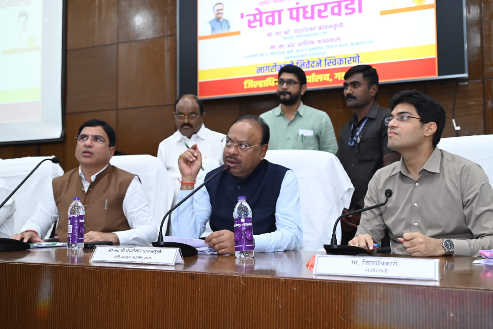 छत्रपती शिवाजी महाराज महाराजस्व अभियानांतर्गत राबविण्यात येत असलेल्या सेवा पंधरवाडा उपक्रमात आज जिल्हाधिकारी कार्यालयातील नियोजन भवन येथे महसूल मंत्री चंद्रशेखर बावनकुळे व वित्त व नियोजन, कृषी, मदत व पुनर्वसन, विधि व न्याय, कामगार राज्यमंत्री तसेच जिल्ह्याचे सहपालकमंत्री ॲड.आशिष जयस्वाल यांनी थेट नागरिकांची निवेदने स्वीकारून त्यांच्या तक्रारी जाणून घेतल्या.