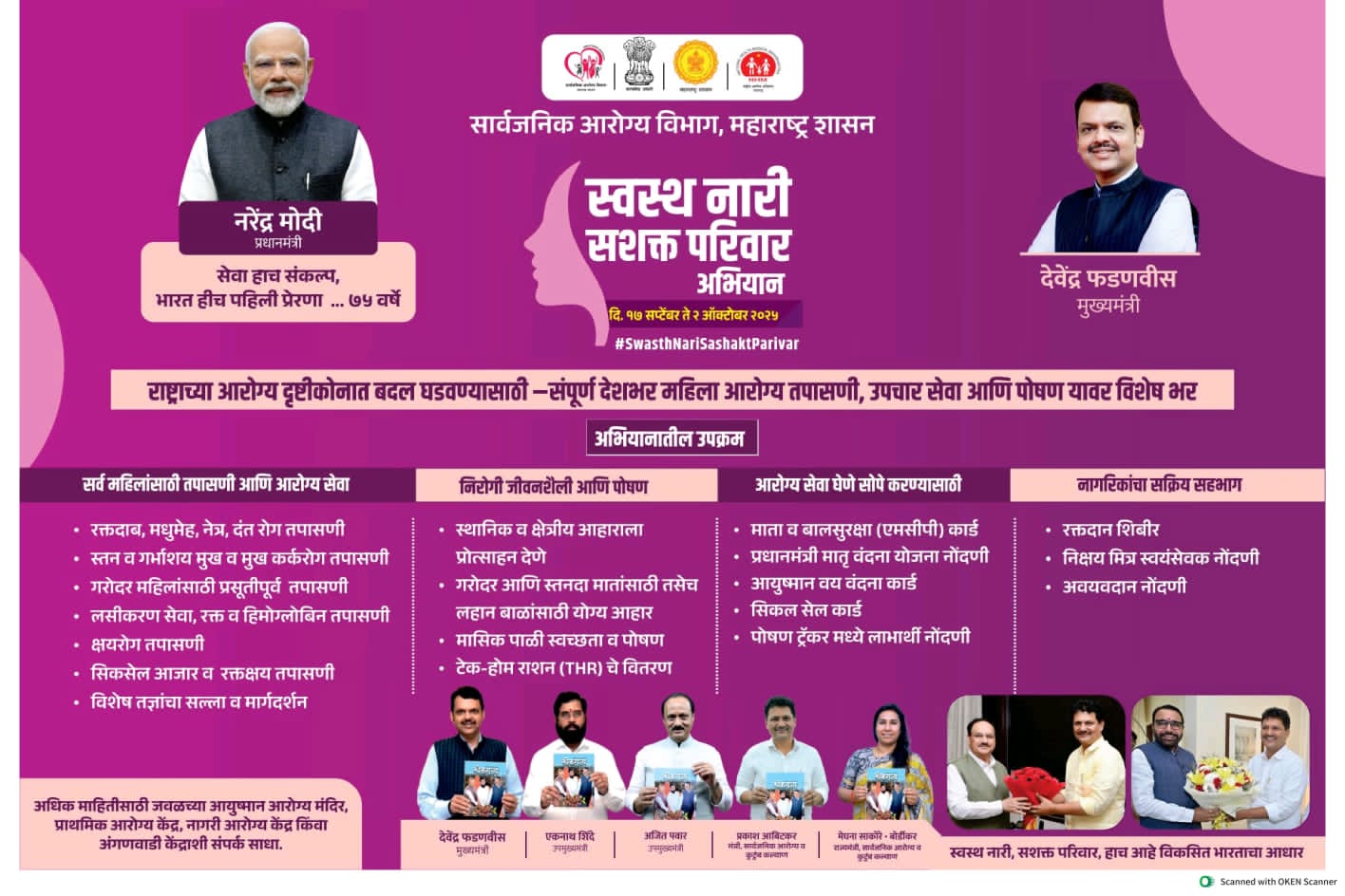 सार्वजनिक आरोग्य विभाग, महाराष्ट्र शासन यांच्या वतीने राबविण्यात येत असलेल्या “स्वस्थ नारी, सशक्त परिवार अभियान” अंतर्गत दिनांक २४ सप्टेंबर २०२५ रोजी ग्रामीण रुग्णालय, सिरोंचा येथे विशेष आरोग्य शिबिराचे आयोजन करण्यात आले. या शिबिराचा लाभ तालुक्यातील नागरिकांना मोफत उपलब्ध करून देण्यात येणार आहे.