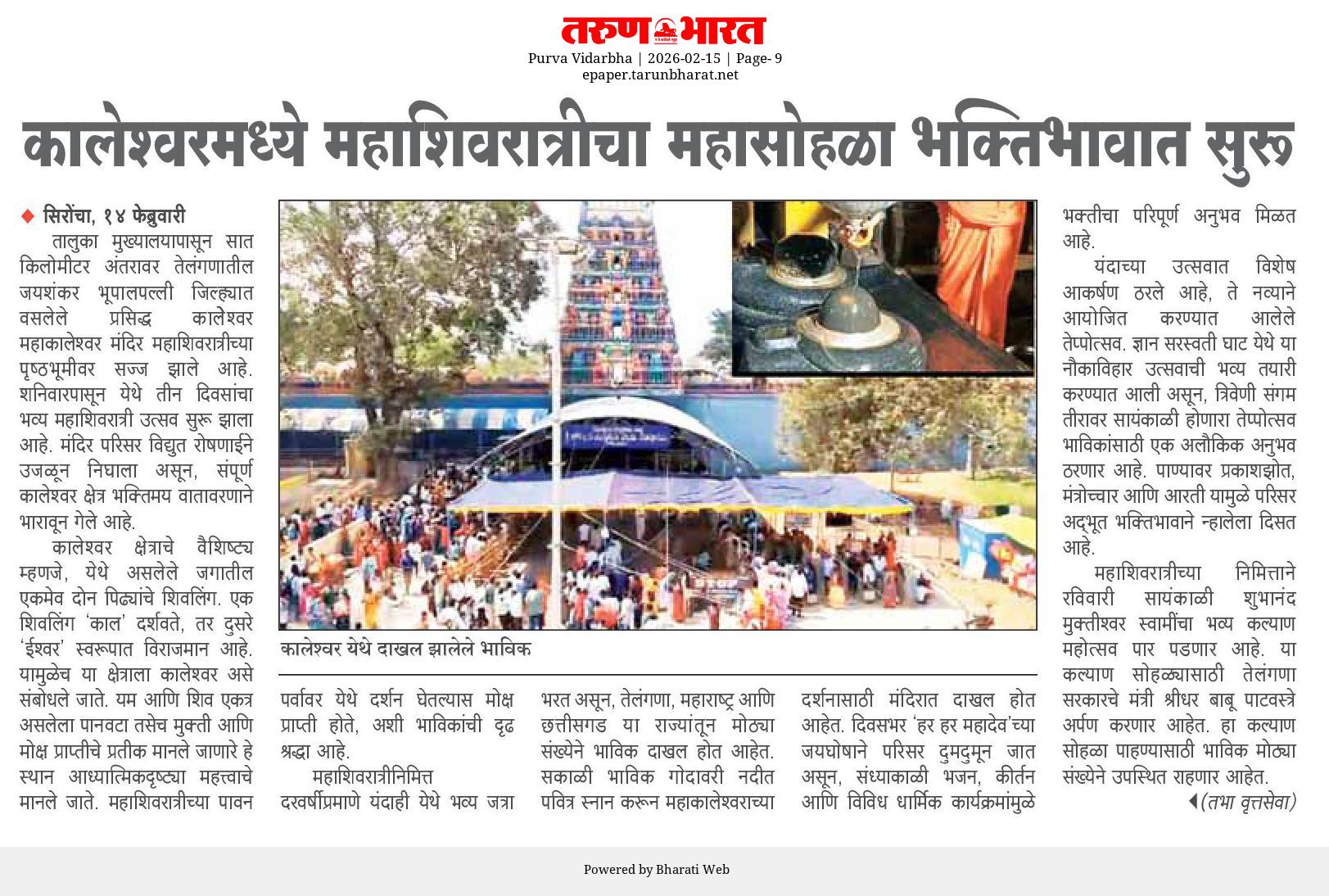 कालेश्वर (जयशंकर भूपालपल्ली) तेलंगाना प्रतिनिधी दिनांक:- 15 फेब्रुवारी 2026